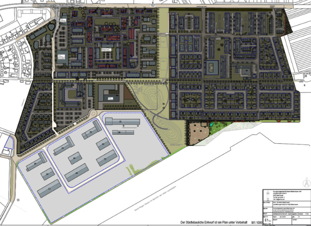 Die Planung des Gewerbequartiers der „Kaisergärten“ zeigt die linksseitige Karte. Selbstverständlich wird auch dieser Bereich komplett neu erschlossen. Da die Zufahrt ausschließlich aus südlicher Richtung erfolgen soll, kann der Verkehr um die „Kaisergärten“ herumgeleitet werden. In den Bestandsgebäuden haben sich bereits einige Firmen angesiedelt. Darüber hinaus stehen diverse Flächen für Neubauten zur Verfügung. Alle Grundstücke des Gewerbequartiers werden mit Wasser-, Fernwärme- und Glasfaseranschlüssen versorgt. Für Mitarbeiterinnen und Mitarbeiter besteht die Möglichkeit, sich in benachbartem Wohnquartier niederzulassen.