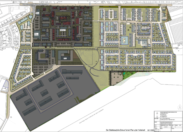 Die linksseitige Karte zeigt die aktuelle Planung des komplett neu erschlossenen Wohnquartiers. Hier sind die Bestandsgebäude, in denen überwiegend Mietwohnungen entstehen sollen, und die zur Verfügung stehenden Bauplätze gut zu erkennen. Auf dem Areal sollen Villen, Einzel- und Doppelhäuser entstehen.